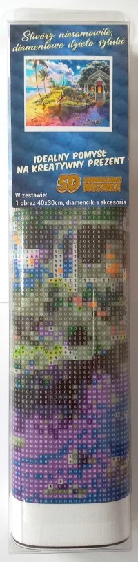 Balení obsahuje: plátno s předtištěným obrázkem, pero na aplikaci kamínků, misku na vysypání kamínků, vosk na nalepení, sadu barevných kamínků Diamantové malování - postup: Horní strana plátna je potažena lepidlem a překrytá průhlednou folií. Folii sundávejte postupně po částech tak, jak budete aplikovat kamínky. Při sejmutí celé folie najednou se může lepicí vrstva znečistit a kamínky by nemusely tak dobře držet. Plátno obsahuje znaky, které jsou uvedeny v přiložené legendě a odkazují na příslušný sáček s kamínky označený číslem. Kamínky z daného sáčku vysypejte do misky. Do hrotu pera naberte vosk, díky kterému se kamínky snadno přichytí na pero. Kamínky perem nanášejte na obrázek. Po nalepení dané barvy kamínky nasypejte zpět do sáčku a pokračujte s další barvou.