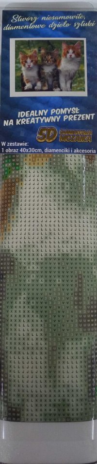Balení obsahuje: plátno s předtištěným obrázkem, pero na aplikaci kamínků, misku na vysypání kamínků, vosk na nalepení, sadu barevných kamínků Diamantové malování - postup: Horní strana plátna je potažena lepidlem a překrytá průhlednou folií. Folii sundávejte postupně po částech tak, jak budete aplikovat kamínky. Při sejmutí celé folie najednou se může lepicí vrstva znečistit a kamínky by nemusely tak dobře držet. Plátno obsahuje znaky, které jsou uvedeny v přiložené legendě a odkazují na příslušný sáček s kamínky označený číslem. Kamínky z daného sáčku vysypejte do misky. Do hrotu pera naberte vosk, díky kterému se kamínky snadno přichytí na pero. Kamínky perem nanášejte na obrázek. Po nalepení dané barvy kamínky nasypejte zpět do sáčku a pokračujte s další barvou.