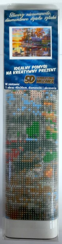 Balení obsahuje: plátno s předtištěným obrázkem, pero na aplikaci kamínků, misku na vysypání kamínků, vosk na nalepení, sadu barevných kamínků Diamantové malování - postup: Horní strana plátna je potažena lepidlem a překrytá průhlednou folií. Folii sundávejte postupně po částech tak, jak budete aplikovat kamínky. Při sejmutí celé folie najednou se může lepicí vrstva znečistit a kamínky by nemusely tak dobře držet. Plátno obsahuje znaky, které jsou uvedeny v přiložené legendě a odkazují na příslušný sáček s kamínky označený číslem. Kamínky z daného sáčku vysypejte do misky. Do hrotu pera naberte vosk, díky kterému se kamínky snadno přichytí na pero. Kamínky perem nanášejte na obrázek. Po nalepení dané barvy kamínky nasypejte zpět do sáčku a pokračujte s další barvou.