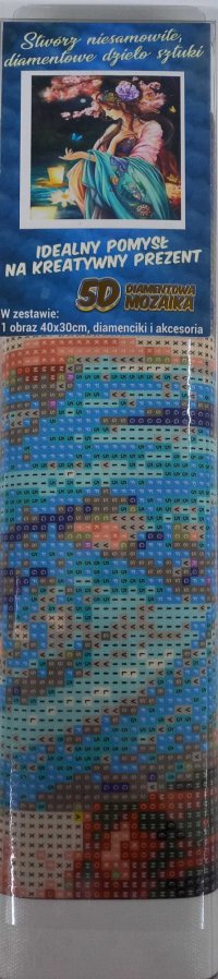 Balení obsahuje: plátno s předtištěným obrázkem, pero na aplikaci kamínků, misku na vysypání kamínků, vosk na nalepení, sadu barevných kamínků Diamantové malování - postup: Horní strana plátna je potažena lepidlem a překrytá průhlednou folií. Folii sundávejte postupně po částech tak, jak budete aplikovat kamínky. Při sejmutí celé folie najednou se může lepicí vrstva znečistit a kamínky by nemusely tak dobře držet. Plátno obsahuje znaky, které jsou uvedeny v přiložené legendě a odkazují na příslušný sáček s kamínky označený číslem. Kamínky z daného sáčku vysypejte do misky. Do hrotu pera naberte vosk, díky kterému se kamínky snadno přichytí na pero. Kamínky perem nanášejte na obrázek. Po nalepení dané barvy kamínky nasypejte zpět do sáčku a pokračujte s další barvou.