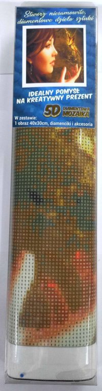 Balení obsahuje: plátno s předtištěným obrázkem, pero na aplikaci kamínků, misku na vysypání kamínků, vosk na nalepení, sadu barevných kamínků Diamantové malování - postup: Horní strana plátna je potažena lepidlem a překrytá průhlednou folií. Folii sundávejte postupně po částech tak, jak budete aplikovat kamínky. Při sejmutí celé folie najednou se může lepicí vrstva znečistit a kamínky by nemusely tak dobře držet. Plátno obsahuje znaky, které jsou uvedeny v přiložené legendě a odkazují na příslušný sáček s kamínky označený číslem. Kamínky z daného sáčku vysypejte do misky. Do hrotu pera naberte vosk, díky kterému se kamínky snadno přichytí na pero. Kamínky perem nanášejte na obrázek. Po nalepení dané barvy kamínky nasypejte zpět do sáčku a pokračujte s další barvou.