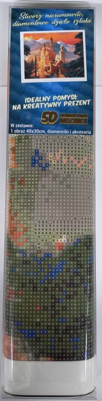 Balení obsahuje: plátno s předtištěným obrázkem, pero na aplikaci kamínků, misku na vysypání kamínků, vosk na nalepení, sadu barevných kamínků Diamantové malování - postup: Horní strana plátna je potažena lepidlem a překrytá průhlednou folií. Folii sundávejte postupně po částech tak, jak budete aplikovat kamínky. Při sejmutí celé folie najednou se může lepicí vrstva znečistit a kamínky by nemusely tak dobře držet. Plátno obsahuje znaky, které jsou uvedeny v přiložené legendě a odkazují na příslušný sáček s kamínky označený číslem. Kamínky z daného sáčku vysypejte do misky. Do hrotu pera naberte vosk, díky kterému se kamínky snadno přichytí na pero. Kamínky perem nanášejte na obrázek. Po nalepení dané barvy kamínky nasypejte zpět do sáčku a pokračujte s další barvou.