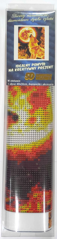 Balení obsahuje: plátno s předtištěným obrázkem, pero na aplikaci kamínků, misku na vysypání kamínků, vosk na nalepení, sadu barevných kamínků Diamantové malování - postup: Horní strana plátna je potažena lepidlem a překrytá průhlednou folií. Folii sundávejte postupně po částech tak, jak budete aplikovat kamínky. Při sejmutí celé folie najednou se může lepicí vrstva znečistit a kamínky by nemusely tak dobře držet. Plátno obsahuje znaky, které jsou uvedeny v přiložené legendě a odkazují na příslušný sáček s kamínky označený číslem. Kamínky z daného sáčku vysypejte do misky. Do hrotu pera naberte vosk, díky kterému se kamínky snadno přichytí na pero. Kamínky perem nanášejte na obrázek. Po nalepení dané barvy kamínky nasypejte zpět do sáčku a pokračujte s další barvou.