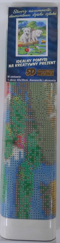 Balení obsahuje: plátno s předtištěným obrázkem, pero na aplikaci kamínků, misku na vysypání kamínků, vosk na nalepení, sadu barevných kamínků Diamantové malování - postup: Horní strana plátna je potažena lepidlem a překrytá průhlednou folií. Folii sundávejte postupně po částech tak, jak budete aplikovat kamínky. Při sejmutí celé folie najednou se může lepicí vrstva znečistit a kamínky by nemusely tak dobře držet. Plátno obsahuje znaky, které jsou uvedeny v přiložené legendě a odkazují na příslušný sáček s kamínky označený číslem. Kamínky z daného sáčku vysypejte do misky. Do hrotu pera naberte vosk, díky kterému se kamínky snadno přichytí na pero. Kamínky perem nanášejte na obrázek. Po nalepení dané barvy kamínky nasypejte zpět do sáčku a pokračujte s další barvou.