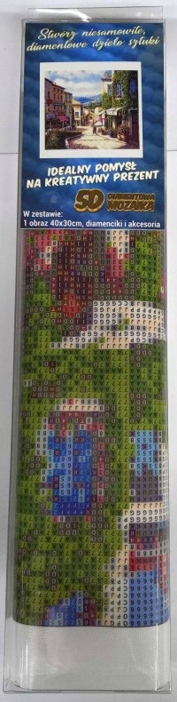 Balení obsahuje: plátno s předtištěným obrázkem, pero na aplikaci kamínků, misku na vysypání kamínků, vosk na nalepení, sadu barevných kamínků Diamantové malování - postup: Horní strana plátna je potažena lepidlem a překrytá průhlednou folií. Folii sundávejte postupně po částech tak, jak budete aplikovat kamínky. Při sejmutí celé folie najednou se může lepicí vrstva znečistit a kamínky by nemusely tak dobře držet. Plátno obsahuje znaky, které jsou uvedeny v přiložené legendě a odkazují na příslušný sáček s kamínky označený číslem. Kamínky z daného sáčku vysypejte do misky. Do hrotu pera naberte vosk, díky kterému se kamínky snadno přichytí na pero. Kamínky perem nanášejte na obrázek. Po nalepení dané barvy kamínky nasypejte zpět do sáčku a pokračujte s další barvou.