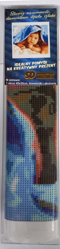Balení obsahuje: plátno s předtištěným obrázkem, pero na aplikaci kamínků, misku na vysypání kamínků, vosk na nalepení, sadu barevných kamínků Diamantové malování - postup: Horní strana plátna je potažena lepidlem a překrytá průhlednou folií. Folii sundávejte postupně po částech tak, jak budete aplikovat kamínky. Při sejmutí celé folie najednou se může lepicí vrstva znečistit a kamínky by nemusely tak dobře držet. Plátno obsahuje znaky, které jsou uvedeny v přiložené legendě a odkazují na příslušný sáček s kamínky označený číslem. Kamínky z daného sáčku vysypejte do misky. Do hrotu pera naberte vosk, díky kterému se kamínky snadno přichytí na pero. Kamínky perem nanášejte na obrázek. Po nalepení dané barvy kamínky nasypejte zpět do sáčku a pokračujte s další barvou.