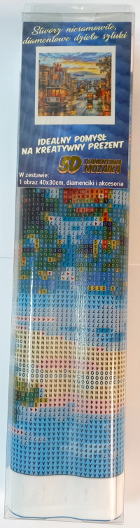 Balení obsahuje: plátno s předtištěným obrázkem, pero na aplikaci kamínků, misku na vysypání kamínků, vosk na nalepení, sadu barevných kamínků Diamantové malování - postup: Horní strana plátna je potažena lepidlem a překrytá průhlednou folií. Folii sundávejte postupně po částech tak, jak budete aplikovat kamínky. Při sejmutí celé folie najednou se může lepicí vrstva znečistit a kamínky by nemusely tak dobře držet. Plátno obsahuje znaky, které jsou uvedeny v přiložené legendě a odkazují na příslušný sáček s kamínky označený číslem. Kamínky z daného sáčku vysypejte do misky. Do hrotu pera naberte vosk, díky kterému se kamínky snadno přichytí na pero. Kamínky perem nanášejte na obrázek. Po nalepení dané barvy kamínky nasypejte zpět do sáčku a pokračujte s další barvou.