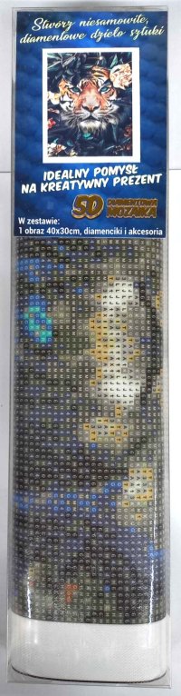 Balení obsahuje: plátno s předtištěným obrázkem, pero na aplikaci kamínků, misku na vysypání kamínků, vosk na nalepení, sadu barevných kamínků Diamantové malování - postup: Horní strana plátna je potažena lepidlem a překrytá průhlednou folií. Folii sundávejte postupně po částech tak, jak budete aplikovat kamínky. Při sejmutí celé folie najednou se může lepicí vrstva znečistit a kamínky by nemusely tak dobře držet. Plátno obsahuje znaky, které jsou uvedeny v přiložené legendě a odkazují na příslušný sáček s kamínky označený číslem. Kamínky z daného sáčku vysypejte do misky. Do hrotu pera naberte vosk, díky kterému se kamínky snadno přichytí na pero. Kamínky perem nanášejte na obrázek. Po nalepení dané barvy kamínky nasypejte zpět do sáčku a pokračujte s další barvou.