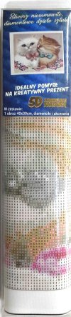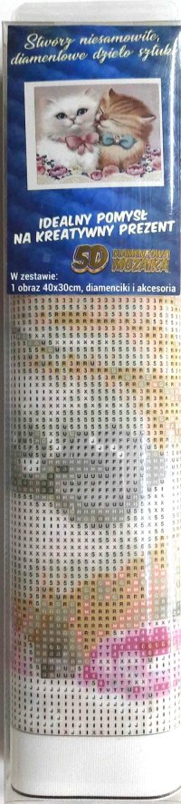 Balení obsahuje: plátno s předtištěným obrázkem, pero na aplikaci kamínků, misku na vysypání kamínků, vosk na nalepení, sadu barevných kamínků Diamantové malování - postup: Horní strana plátna je potažena lepidlem a překrytá průhlednou folií. Folii sundávejte postupně po částech tak, jak budete aplikovat kamínky. Při sejmutí celé folie najednou se může lepicí vrstva znečistit a kamínky by nemusely tak dobře držet. Plátno obsahuje znaky, které jsou uvedeny v přiložené legendě a odkazují na příslušný sáček s kamínky označený číslem. Kamínky z daného sáčku vysypejte do misky. Do hrotu pera naberte vosk, díky kterému se kamínky snadno přichytí na pero. Kamínky perem nanášejte na obrázek. Po nalepení dané barvy kamínky nasypejte zpět do sáčku a pokračujte s další barvou.