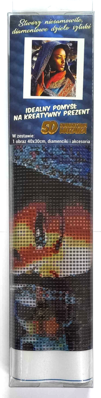 Balení obsahuje: plátno s předtištěným obrázkem, pero na aplikaci kamínků, misku na vysypání kamínků, vosk na nalepení, sadu barevných kamínků Diamantové malování - postup: Horní strana plátna je potažena lepidlem a překrytá průhlednou folií. Folii sundávejte postupně po částech tak, jak budete aplikovat kamínky. Při sejmutí celé folie najednou se může lepicí vrstva znečistit a kamínky by nemusely tak dobře držet. Plátno obsahuje znaky, které jsou uvedeny v přiložené legendě a odkazují na příslušný sáček s kamínky označený číslem. Kamínky z daného sáčku vysypejte do misky. Do hrotu pera naberte vosk, díky kterému se kamínky snadno přichytí na pero. Kamínky perem nanášejte na obrázek. Po nalepení dané barvy kamínky nasypejte zpět do sáčku a pokračujte s další barvou.