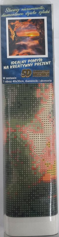 Balení obsahuje: plátno s předtištěným obrázkem, pero na aplikaci kamínků, misku na vysypání kamínků, vosk na nalepení, sadu barevných kamínků Diamantové malování - postup: Horní strana plátna je potažena lepidlem a překrytá průhlednou folií. Folii sundávejte postupně po částech tak, jak budete aplikovat kamínky. Při sejmutí celé folie najednou se může lepicí vrstva znečistit a kamínky by nemusely tak dobře držet. Plátno obsahuje znaky, které jsou uvedeny v přiložené legendě a odkazují na příslušný sáček s kamínky označený číslem. Kamínky z daného sáčku vysypejte do misky. Do hrotu pera naberte vosk, díky kterému se kamínky snadno přichytí na pero. Kamínky perem nanášejte na obrázek. Po nalepení dané barvy kamínky nasypejte zpět do sáčku a pokračujte s další barvou.