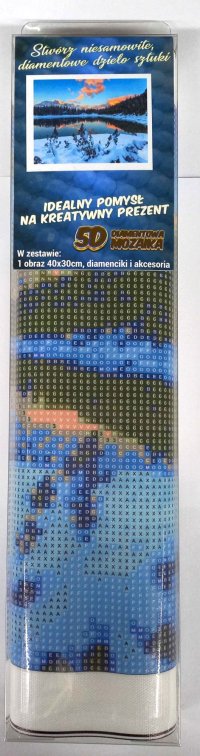 Balení obsahuje: plátno s předtištěným obrázkem, pero na aplikaci kamínků, misku na vysypání kamínků, vosk na nalepení, sadu barevných kamínků Diamantové malování - postup: Horní strana plátna je potažena lepidlem a překrytá průhlednou folií. Folii sundávejte postupně po částech tak, jak budete aplikovat kamínky. Při sejmutí celé folie najednou se může lepicí vrstva znečistit a kamínky by nemusely tak dobře držet. Plátno obsahuje znaky, které jsou uvedeny v přiložené legendě a odkazují na příslušný sáček s kamínky označený číslem. Kamínky z daného sáčku vysypejte do misky. Do hrotu pera naberte vosk, díky kterému se kamínky snadno přichytí na pero. Kamínky perem nanášejte na obrázek. Po nalepení dané barvy kamínky nasypejte zpět do sáčku a pokračujte s další barvou.