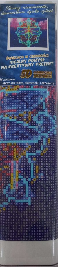 Balení obsahuje: plátno s předtištěným obrázkem, pero na aplikaci kamínků, misku na vysypání kamínků, vosk na nalepení, sadu barevných kamínků Diamantové malování - postup: Horní strana plátna je potažena lepidlem a překrytá průhlednou folií. Folii sundávejte postupně po částech tak, jak budete aplikovat kamínky. Při sejmutí celé folie najednou se může lepicí vrstva znečistit a kamínky by nemusely tak dobře držet. Plátno obsahuje znaky, které jsou uvedeny v přiložené legendě a odkazují na příslušný sáček s kamínky označený číslem. Kamínky z daného sáčku vysypejte do misky. Do hrotu pera naberte vosk, díky kterému se kamínky snadno přichytí na pero. Kamínky perem nanášejte na obrázek. Po nalepení dané barvy kamínky nasypejte zpět do sáčku a pokračujte s další barvou.