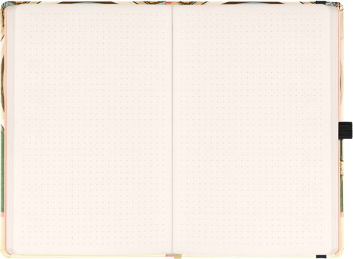 Notes v pevných deskách s motivem díla Alfonse Muchy, s uzavíráním na gumičku, kapsou na drobnosti a poutkem na tužku. Vevnitř najdete 172 tečkovaných stran na žlutém papíře pro zapsání všech vašich nápadů.