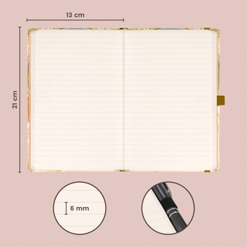 Kvalitní linkovaný notes v pevných deskách s uzavíráním na gumičku, poutkem na tužku a vnitřní kapsou na drobnosti.