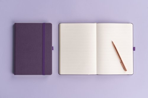 Linkovaný notes Aprint Neo ve fialovém provedení. Klasika i elegance, nejžádanější povrch, na který lze snadno razit firemní loga s jemnou strukturou.