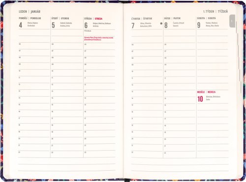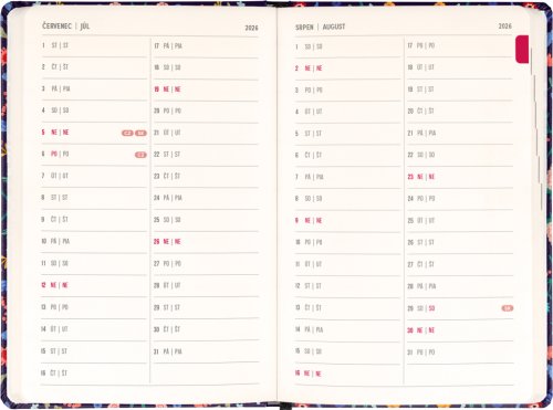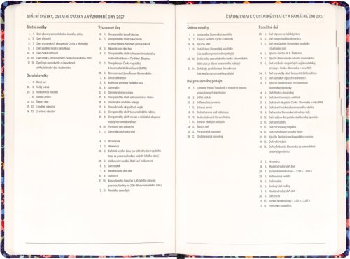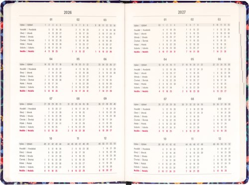 Osmnáctiměsíční diář obsahuje přehled na rok 2026 a 2027, seznam českých a slovenských jmen a česko-slovenské týdenní sloupcové kalendárium se jmény a svátky. Kalendárium začíná v červenci 2026 a končí v prosinci 2027.
