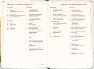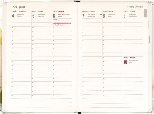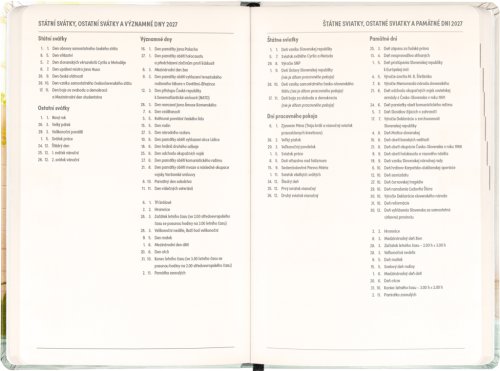 Osmnáctiměsíční diář obsahuje přehled na rok 2026 a 2027, seznam českých a slovenských jmen a česko-slovenské týdenní sloupcové kalendárium se jmény a svátky.