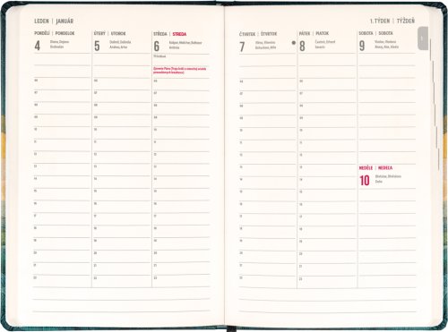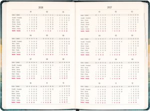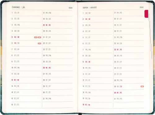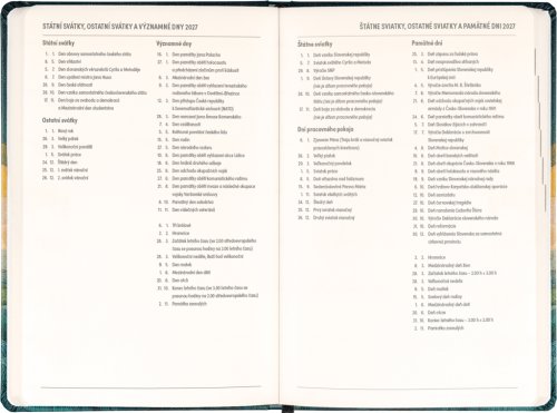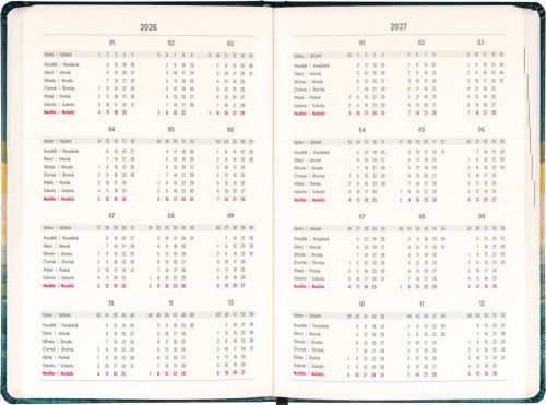Osmnáctiměsíční diář obsahuje přehled na rok 2026 a 2027, seznam českých a slovenských jmen a česko-slovenské týdenní sloupcové kalendárium se jmény a svátky. Kalendárium začíná v červenci 2026 a končí v prosinci 2027.