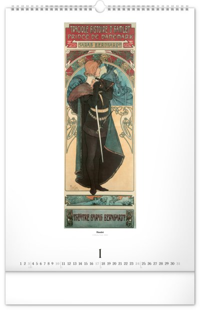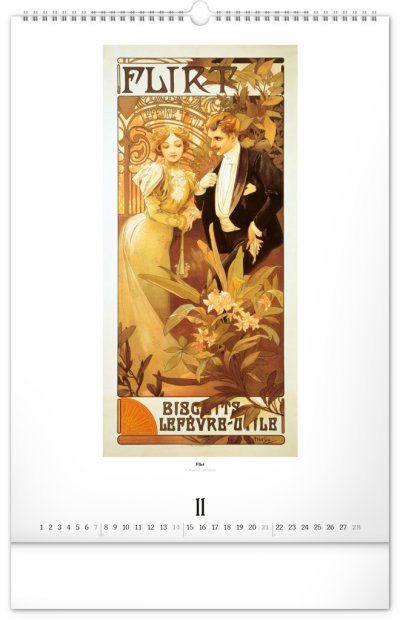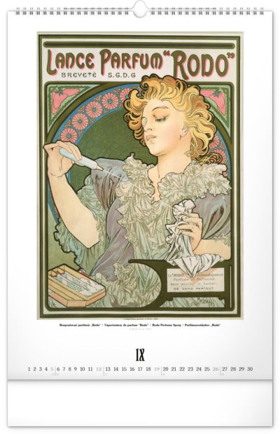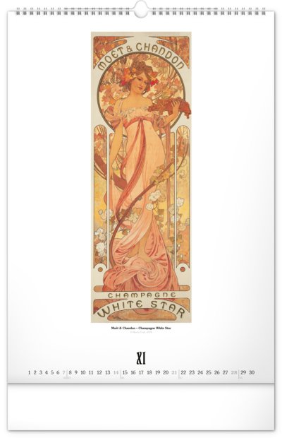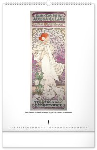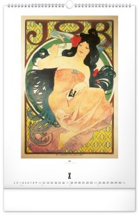 Nástěnný kalendář ve velkém formátu s reprodukcemi obrazů oblíbeného secesního malíře českého původu. Reprodukce doplňuje vkusné univerzální kalendárium s vyznačenými nedělemi a popisky děl ve čtyřech jazycích (CZ, FR, EN, DE).