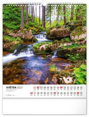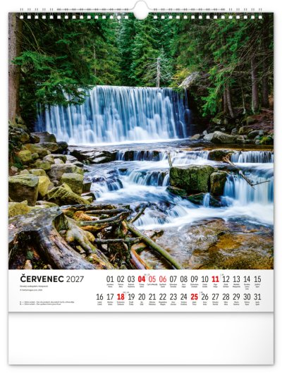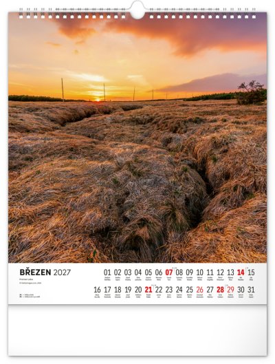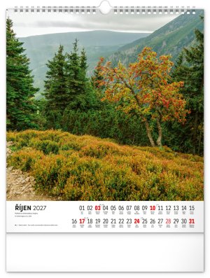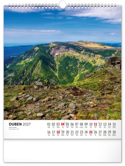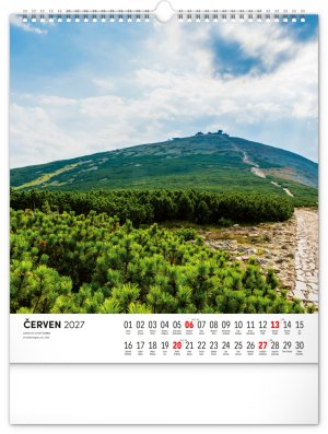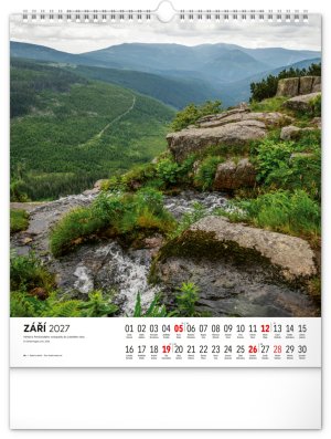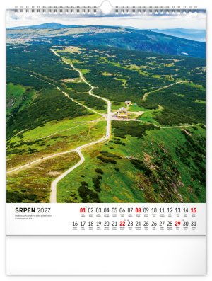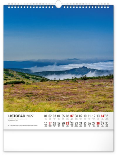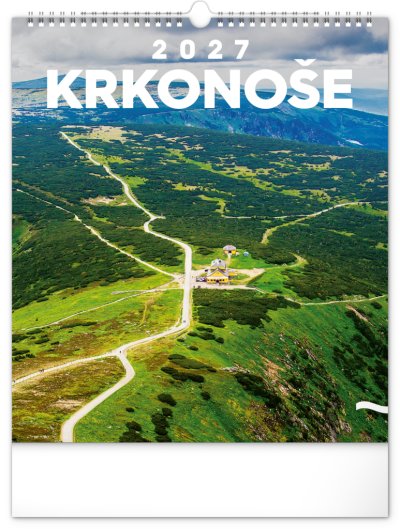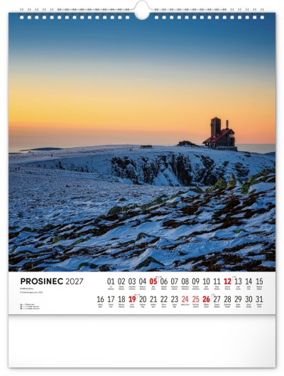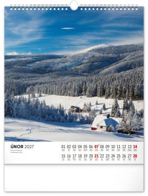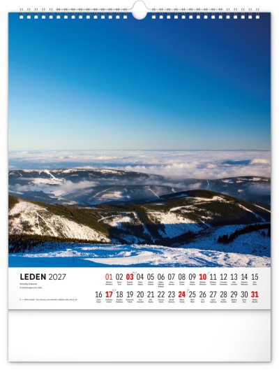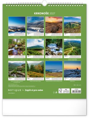 Dvanáct působivých snímků zachycujících krásu Krkonoš ve čtvercovém formátu. Fotografie jsou doplněny jednoduchým kalendáriem na bílém pozadí.