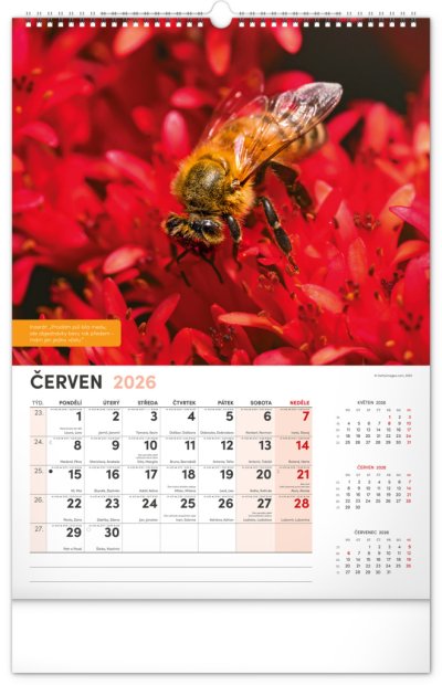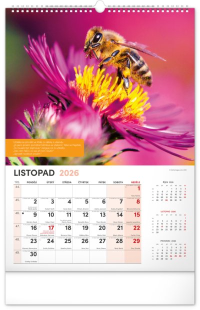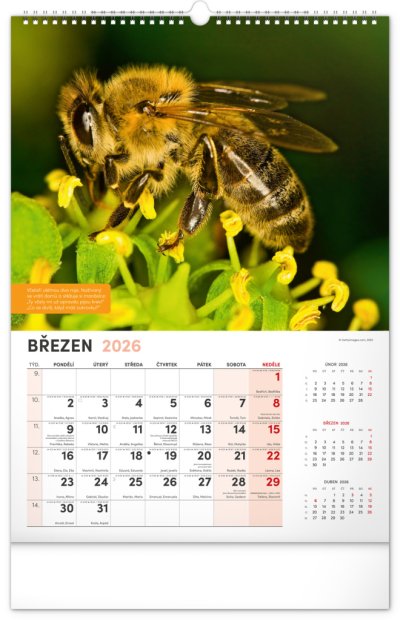 Nástěnný kalendář pro všechny začínající i pokročilé včelaře. Fotografie každý měsíc doplňují pranostiky, včelařská moudra a co by měl v daný měsíc včelař udělat. Kalendář obsahuje české kalendárium se jmény a svátky, také památné dny a východy a západy slunce. S naším kalendářem se budete hned pustit do včelaření!