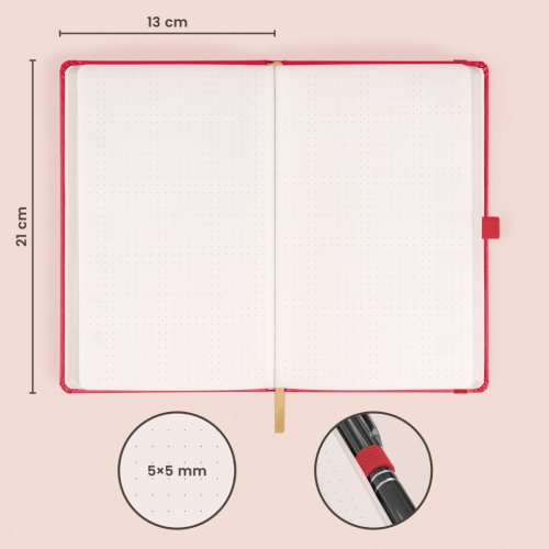 Praktický a lehký tečkovaný notes v klasické červené barvě má povrch s hrubší strukturou, na který si můžete nechat vyrazit logo společnosti. Notes má pevnou knižní vazbu a zakulacené rohy, poutko na tužku, elastickou gumičku a textilní záložku. Tečky mají 5 mm a jsou na kvalitním žlutém papíře.