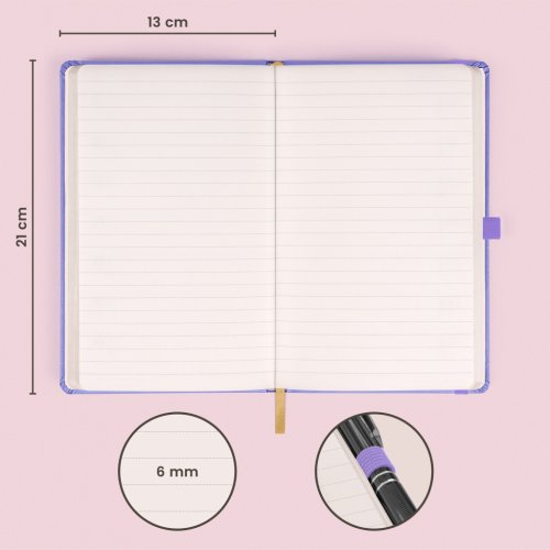 Praktický a lehký linkovaný notes v trendy barvě lila má povrch s jemnou strukturou, na který si můžete nechat vyrazit logo společnosti. Notes má pevnou knižní vazbu a zakulacené rohy, poutko na tužku, elastickou gumičku a textilní záložku. Linky mají 6 mm a jsou na kvalitním žlutém papíře.