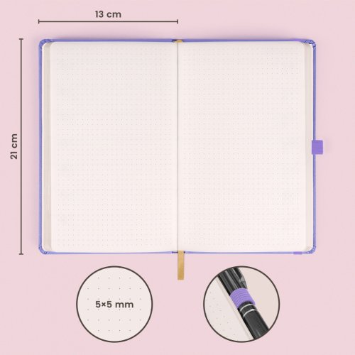 Praktický a lehký tečkovaný notes v trendy barvě lila má povrch s jemnou strukturou, na který si můžete nechat vyrazit logo společnosti. Notes má pevnou knižní vazbu a zakulacené rohy, poutko na tužku, elastickou gumičku a textilní záložku. Tečky mají 5 mm a jsou na kvalitním žlutém papíře.