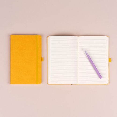 Praktický a lehký linkovaný notes v trendy žluté barvě má povrch s jemnou strukturou, na který si můžete nechat vyrazit logo společnosti. Notes má pevnou knižní vazbu a zakulacené rohy, poutko na tužku, elastickou gumičku a textilní záložku. Linky mají 6 mm a jsou na kvalitním žlutém papíře.
