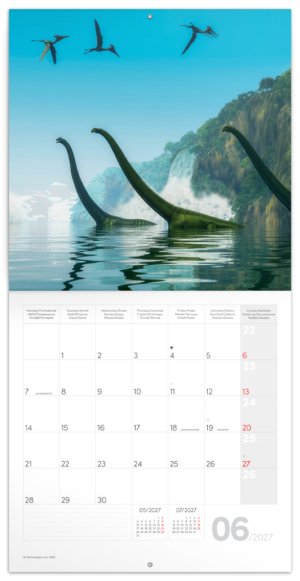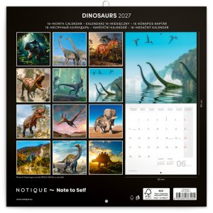 Poznámkový kalendář s věrnými ilustracemi pravěkých dinosaurů a šestijazyčným kalendáriem uzpůsobeným pro vaše plány a poznámky.