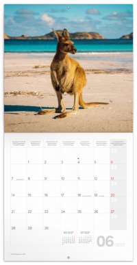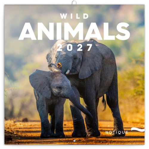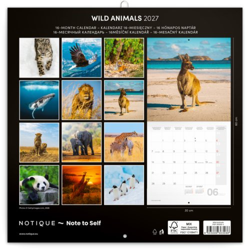Dvanáct fotografií divokých zvířat v praktickém poznámkovém kalendáři. Kalendář obsahuje přehledné kalendárium od září 2026 do prosince 2027 v šesti jazycích, měsíční fáze, důležité svátky a prostor pro poznámky na každý den.