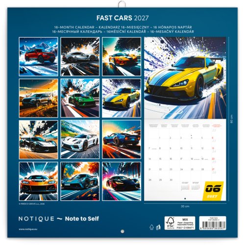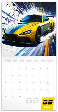 S tímto poznámkovým kalendářem se každý měsíc ocitnete ve světě těch nejfantastičtějších aut. V kalendáři kromě obrázků najdete přehledné kalendárium od září 2026 do prosince 2027 v šesti jazycích, měsíční fáze, důležité svátky a prostor pro poznámky na každý den.