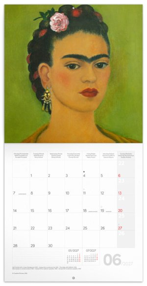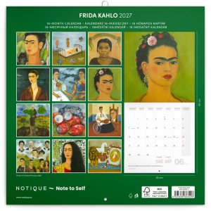 Ponořte se do světa malířky, jejíž život i tvorba se staly symbolem odvahy a osobitého umění. Obrazy ikonické umělkyně Fridy Kahlo na stránkách poznámkového kalendáře. Obsahuje přehledné kalendárium od září 2026 do prosince 2027 v šesti jazycích, měsíční fáze, důležité svátky a prostor pro poznámky na každý den.