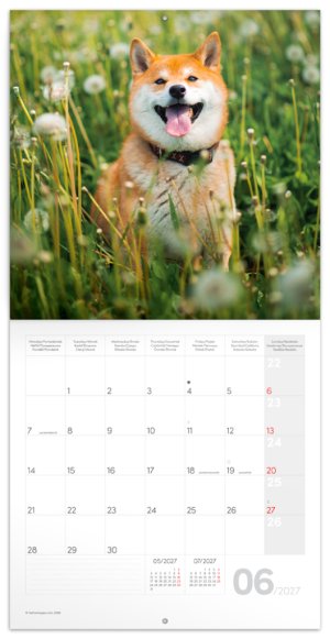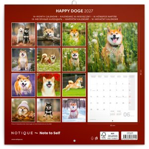 Poznámkový kalendář s 12 fotografiemi krásných psů vyvolávajících dobrou náladu. V kalendáři kromě fotek najdete přehledné kalendárium od září 2026 do prosince 2027 v šesti jazycích, měsíční fáze, důležité svátky a prostor pro poznámky na každý den.
