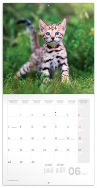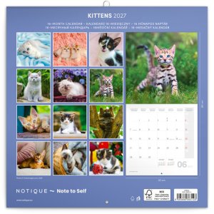 Poznámkový kalendář s hravými a roztomilými koťaty, se kterými byste se nejraději pomazlili. Uvnitř najdete přehledné kalendárium od září 2026 do prosince 2027 v šesti jazycích, měsíční fáze, důležité svátky a prostor pro poznámky na každý den.