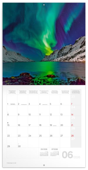 Poznámkový kalendář s dvanácti fotografiemi, na kterých se podařilo dokonale zachytit tak vzácný jev, jako je polární záře. Uvnitř najdete přehledné kalendárium od září 2024 do prosince 2025 v šesti jazycích, měsíční fáze, důležité svátky a prostor pro poznámky na každý den.