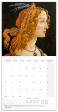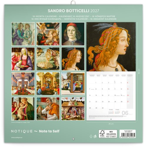 Poznámkový kalendář s výběrem obrazů ikonického italského malíře Sandra Botticelliho. Obsahuje přehledné kalendárium od září 2026 do prosince 2027 v šesti jazycích, měsíční fáze, důležité svátky a prostor pro poznámky na každý den.