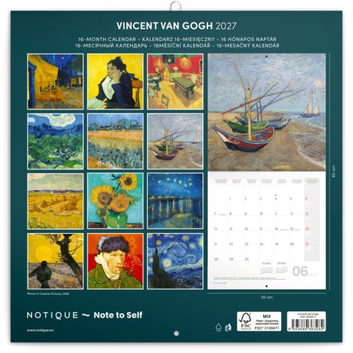 Buďte nablízku talentu malíře, jehož sláva přišla až s jeho smrtí. Obrazy legendárního umělce Vincenta van Gogha na stránkách poznámkového kalendáře. Obsahuje přehledné kalendárium od září 2026 do prosince 2027 v šesti jazycích, měsíční fáze, důležité svátky a prostor pro poznámky na každý den.