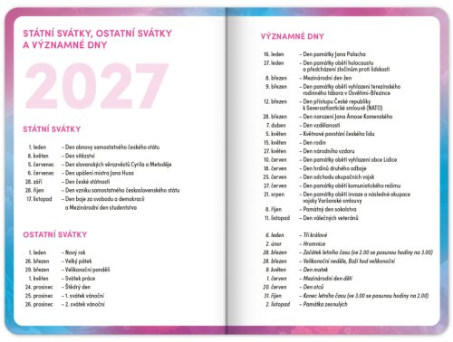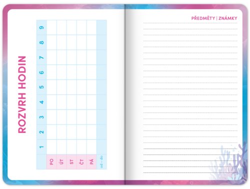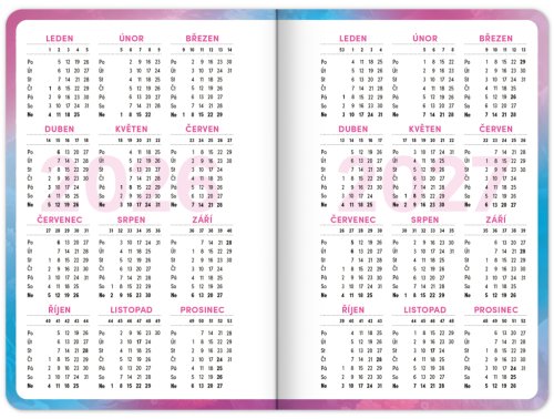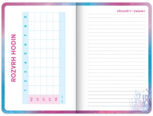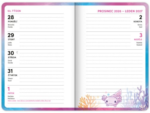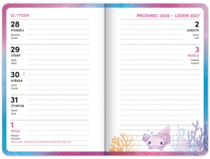 Praktický školní diář pro všechny školáky s motivem zvířátka axolotla. Obsahuje taháky z češtiny, matematiky a angličtiny. Hodit se budou také rozvrhy hodin a přehled termínů prázdnin.