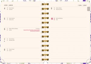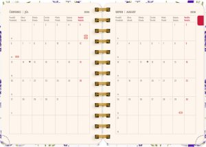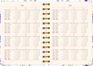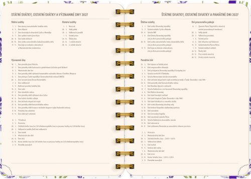 Osmnáctiměsíční diář obsahuje přehled na rok 2026 a 2027, seznam českých a slovenských jmen, česko-slovenské týdenní řádkové kalendárium se jmény a svátky a prostor na poznámky v každém týdnu. Kalendárium začíná v červenci 2026 a končí v prosinci 2027.