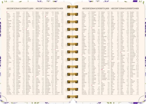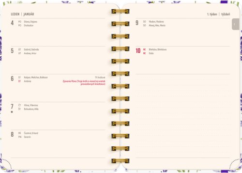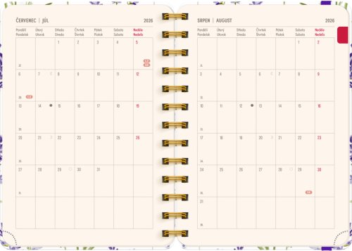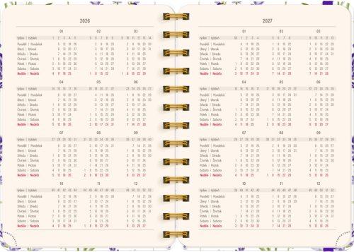 Osmnáctiměsíční diář obsahuje přehled na rok 2026 a 2027, seznam českých a slovenských jmen, česko-slovenské týdenní řádkové kalendárium se jmény a svátky a prostor na poznámky v každém týdnu.