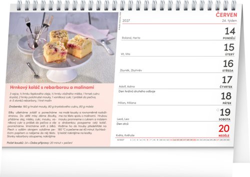 Kalendář s recepty na zákusky, moučníky i „sladké tečky“. Každý recept je doplněn fotografií výsledného pokrmu. Týdenní kalendárium s prostorem pro poznámky obsahuje také svátky, památné dny, měsíční fáze a přehled na celý rok.
