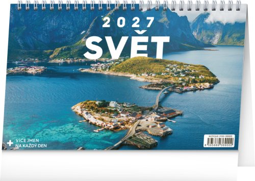 Praktický stolní kalendář s 52 fotografiemi těch nejkrásnějších a nejzajímavějších koutů celého světa. Procestujte svět křížem krážem a podívejte se na místa, která běžně nespatříte. Navštivte světové metropole i zapadlé vesničky, aniž byste museli utrácet za dovolenou. Stolní kalendář s českým kalendáriem obsahuje svátky a památné dny, měsíční fáze a přehled na celý rok 2027 a 2028.