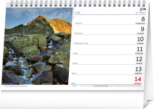 Stolní kalendář s těmi nejmalebnějšími pohledy na krajinu na Slovensku. Fotografie doplňuje slovenské týdenní kalendárium se jmény, svátky a památnými dny.