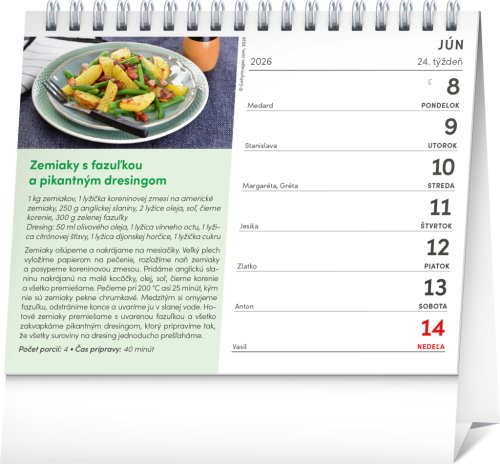 V kalendáři najdete 53 pečlivě vybraných receptů z tradiční slovenské kuchyně. Kalendář obsahuje týdenní slovenské kalendárium se jmény, svátky a památnými dny.