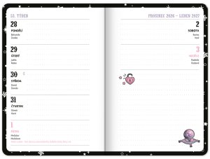 Praktický diář pro všechny větší školáky a studenty s motivem Kuromi. Obsahuje taháky z matematiky, fyziky, chemie a angličtiny. Hodit se budou také rozvrhy hodin a přehled termínů prázdnin.