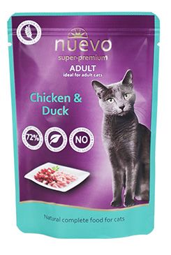 Kočičí kapsa Nuevo Adult kuře a kachna je kompletní krmivo pro dospělé kočky všech plemen s kachním a kuřecím masem. Díky vysokému obsahu masa a přírodních surovin a žádnému obsahu umělých přísad, obilí a lepku patří toto krmivo do vysoce kvaliního a i ta nejvybíravější kočička si jej určitě zamiluje!