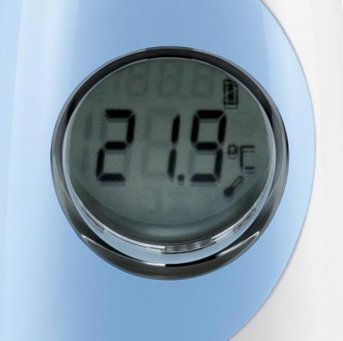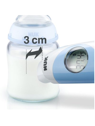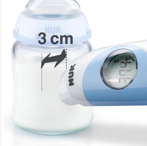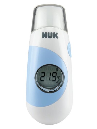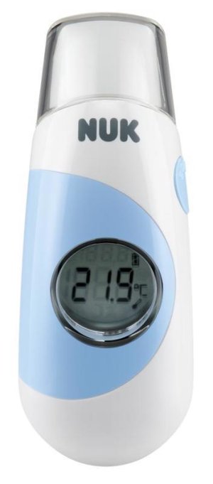 NUK Baby Flash obsahuje infračervený senzor. Měření probíhá pomocí tohoto čidla bez dotyku, držením měřící špičky v max. 3 cm odstupu od čela. Naměřená hodnota teploty se zobrazí během sekundy na digitální display. LCD display zobrazuje výsledek měření v C ° a F °. V případě zvýšené teploty zazní akustické varování. Pomocí němého módu lze všechny signální zvuky přístroje vypnout.