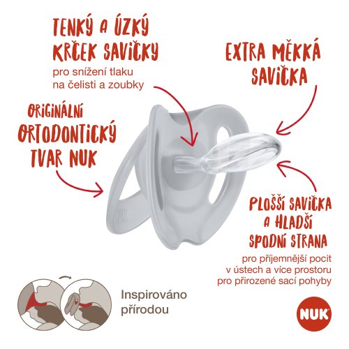 Každý den čeká na vaše děti mnoho vzrušujících dobrodružství, během nichž je dudlík nepostradatelným společníkem, který jim dává pocit jistoty a bezpečí. Ať už vaše dítě rozruší neznámé tváře, nové zvuky či prostředí, známé instinktivní sání dudlíku je opět dokáže rychle uklidnit. Abychom tento pocit zintenzivnili, vyvinuli specialisté ještě lepší tvar dudlíků NUK. Sací část dudlíku napodobuje tvar matčiny bradavky při kojení, takže se při sání dokáže optimálně přizpůsobit dětským ústům. Díky úzkému a plochému tvaru sací části se tlak na čelisti i zuby snižuje, a poskytuje tak jazyku dostatek prostoru pro přirozené sací pohyby. Dudlíky NUK se dokonale přizpůsobí dětským ústům a děti si na něj velmi rychle zvyknou, což poskytuje ještě větší pohodlí jak rodičům, tak dětem samotným.